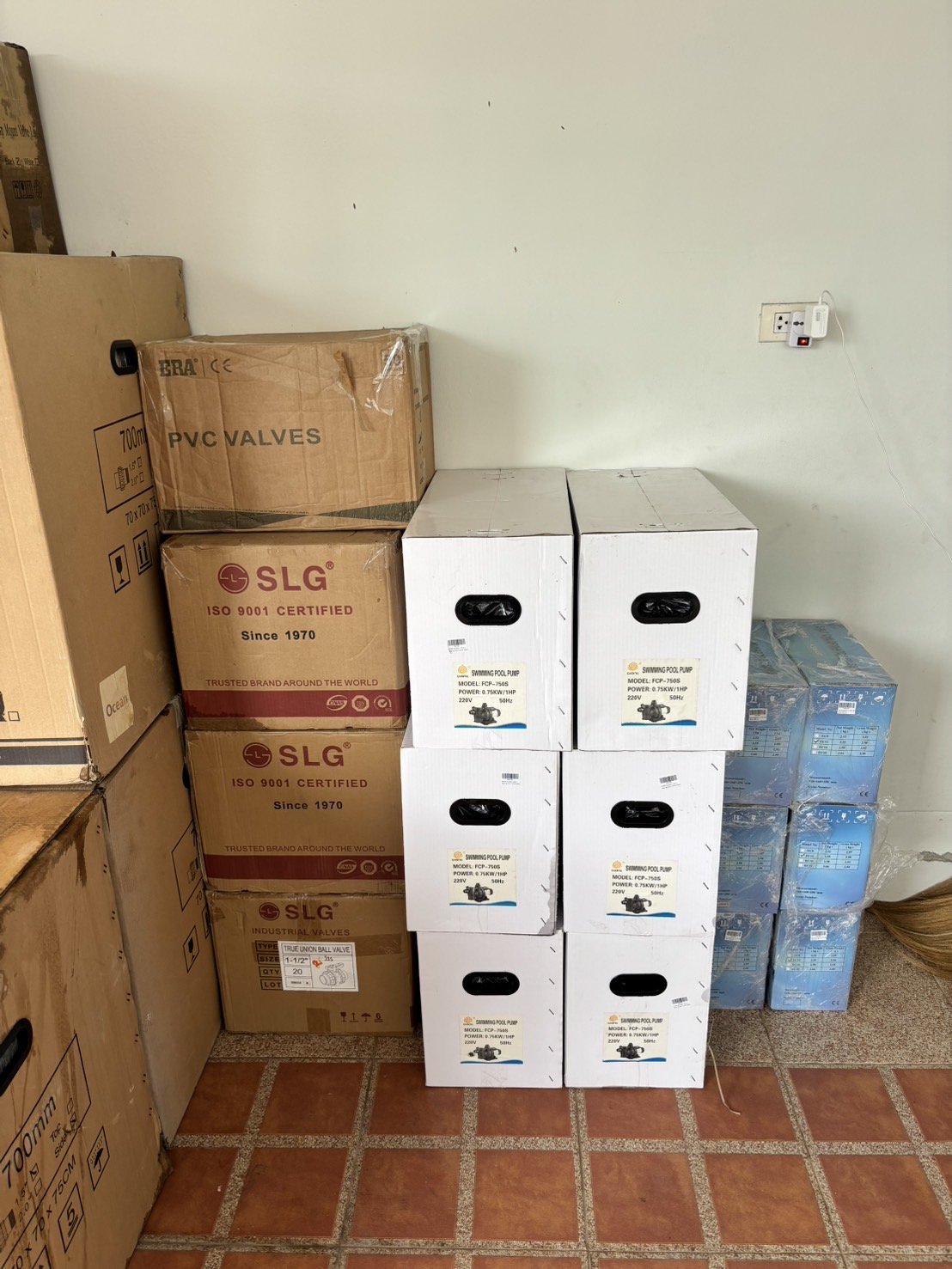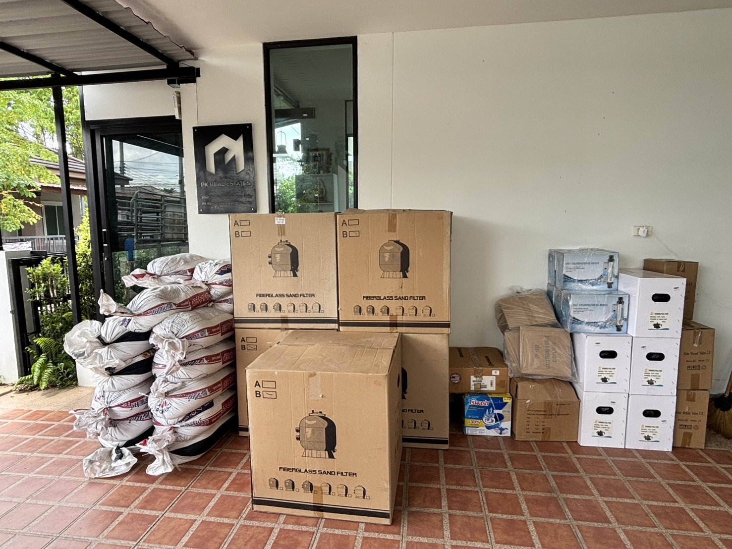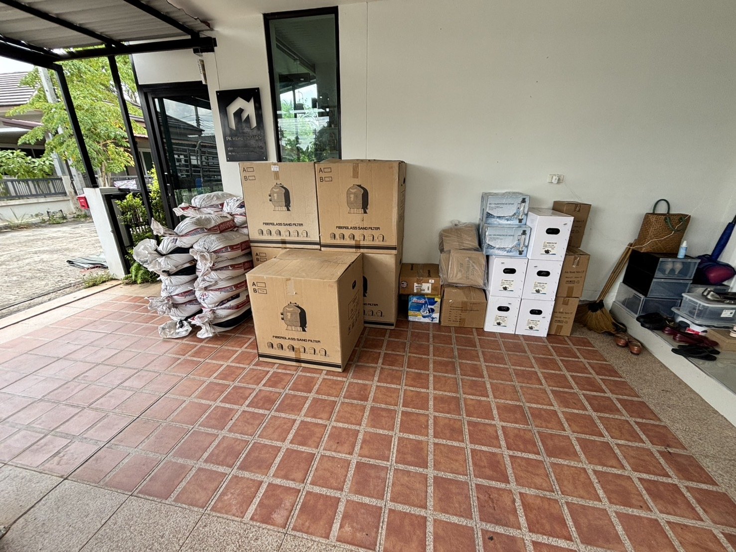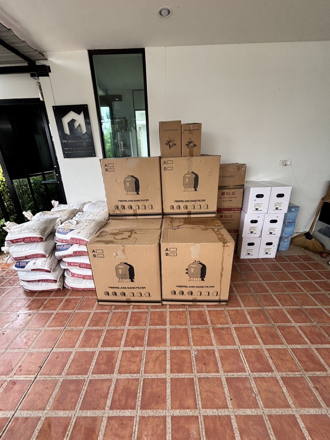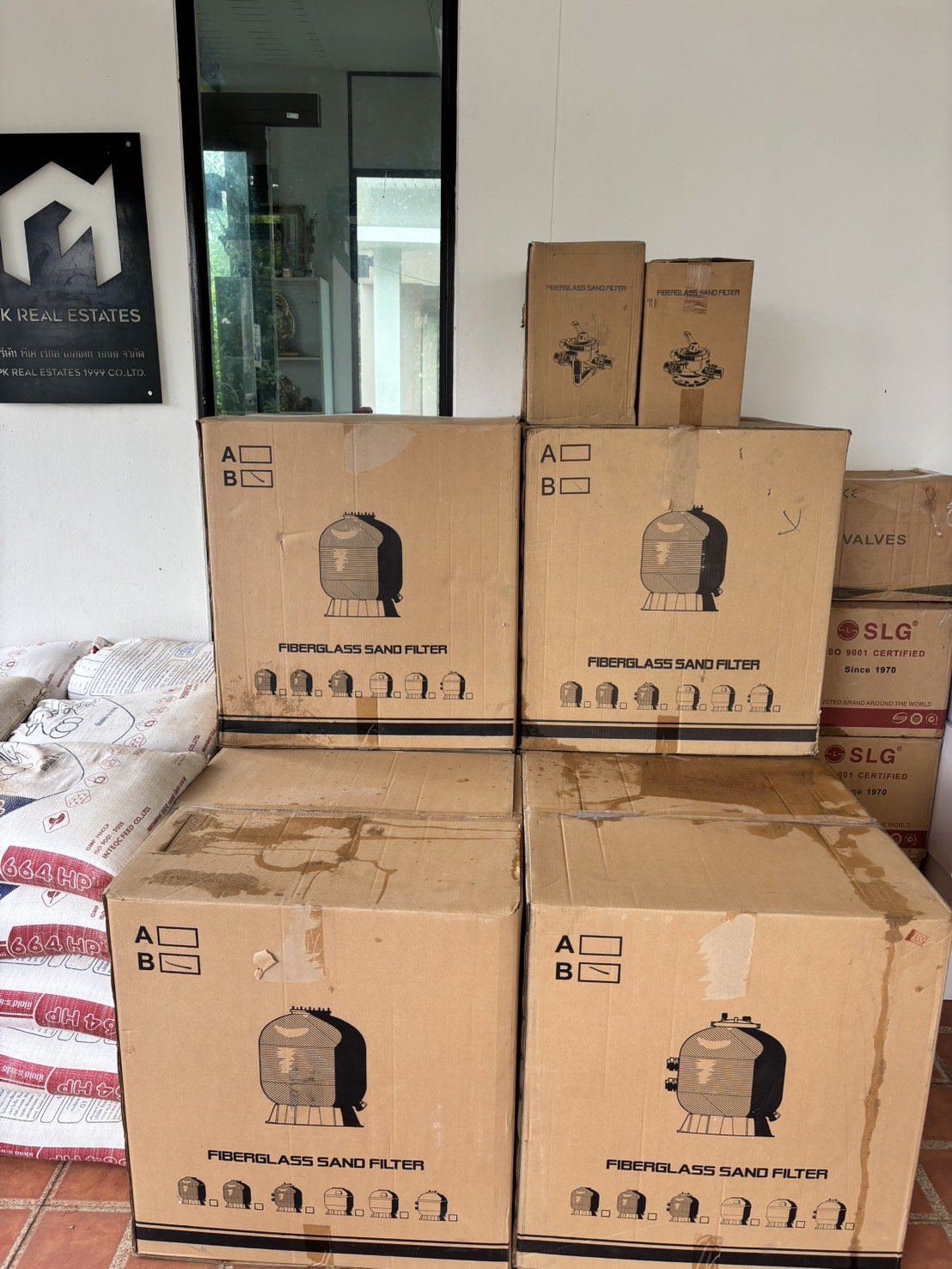 ทางลูกค้าลือกใช้ ปั๊มสระว่ายน้ำ GLONG รุ่น FCP-750 (1HP) ใช้เครื่องผลิตคลอรีนจากเกลือ Pro Pool SQ12 และใช้ ถังกรองทราย Pro Pool PPT 700 [ 28" ]